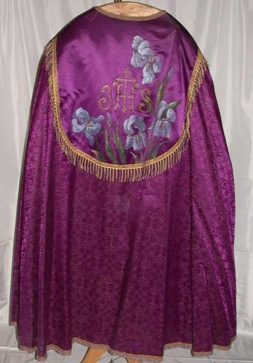 Chape 13 : soie (violette) : tissu façonné, satin, peint, polychrome, application sur textile. Oeuvre déposée. Limite 19e siècle 20e siècle. Représentation : I.H.S. ; iris. Fig. 44.