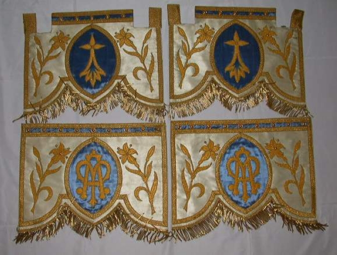 Garniture de brancard de procession : soie (blanche, bleue) : satin, brodé, polychrome ; fil métal : doré. Oeuvre déposée. 1ère moitié 20e siècle. Représentation : croix ; représentation végétale. Fig. 27.
