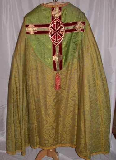 Chape 11 : soie (verte) : tissu façonné, application sur textile ; fil métal : doré. Oeuvre déposée. Milieu 20e siècle. Représentation : Chrisme ; croix ; Alpha & Oméga. Fig. 42.