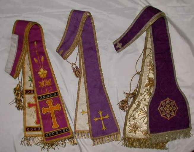 Étole pastorale réversible 2 : soie (blanche, violette) : tissu façonné, application sur textile ; fil métal : doré. Oeuvre déposée. 2e quart 20e siècle. Représentation : croix. Fig. 56.