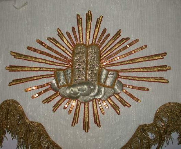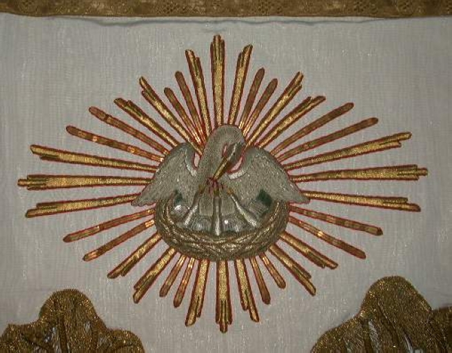 Agneau aux sept sceaux, les Tables de la loi, Pélican mystique, I.H.S. sur des quadrilobes rayonnants.