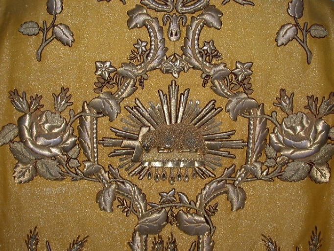 Sur la chasuble : Agneau aux sept sceaux, rinceaux de vigne, de blé et de roses.