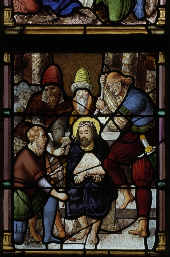 Verrière de 1569 avec quelques parties (les parties du tympan) restaurées vers 1875 (armoiries du pape et de l'êvéque de Rennes) 19e siècle et en 1922 d'après Paul Banéat. La présence de deux dates différentes sur un même panneau est expliqué de la manière suivante par l'Abbé Blot : en 1564, un décrêt de Charles IX modifie le début de l'année, de pâques on passe au premier janvier. Le décrêt fut appliqué durant l'année 1568-1569. On ne sait pas qui est l'auteur de cette Passion du Christ. Cependant, la présence toute proche d'une même représentation à Saint-Gondran, signé de Michel Bayonne, peut laisser supposer une collaboration des membres de l'atelier du maître-verrier, et ce, en dépit de différences stylistiques.