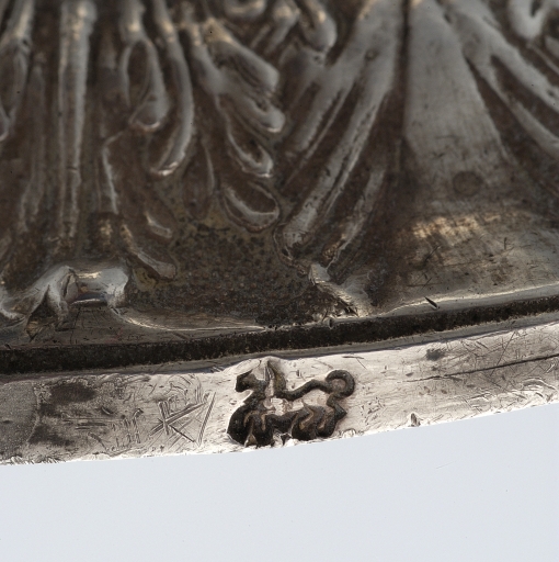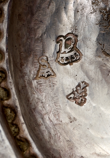 Poinçon de maître : lettres AP séparées par une fleur de lys couronnée avec 2 grains de remèdes. Poinçon de charge : A miniscule couronné. Lettre-date : S majuscule avec couronne ouverte. Poinçon de décharge de Paris : cheval. Les poinçons de maître, de charge et de lettre-date se trouvent sur le couvercle et sous le pied. Celui de maître se trouve aussi sur la coupe. Quant à celui de décharge, on le trouve sur le pied.