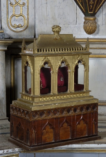 Inscriptions manuscrites sur les médaillons contenant les reliques ; dans le premier reliquaire : St Armel / St Vincent de P. ; dans le second reliquaire : St Nicolas / St Ludovicus Reg. / S. Philom. V. M.