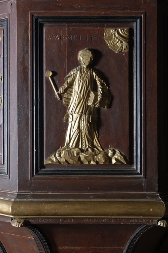 Signature et date sont gravées sur et sous le panneau central : ST ARMEL : 1785 / MORAUX FECIT MENUISSIER [sic] : A MELESSE.