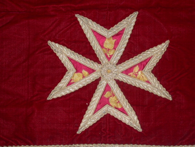 Sur le dos de la chasuble : I.H.S., lancette, ornementation, croix.
