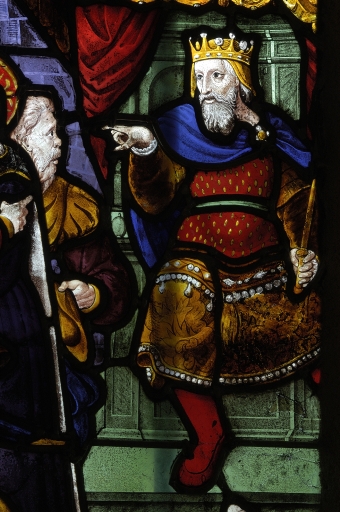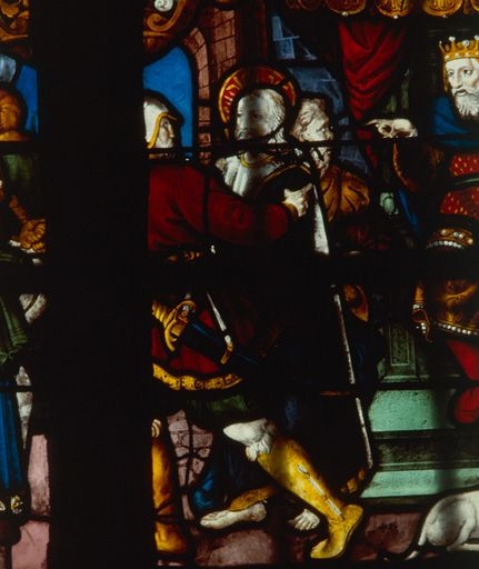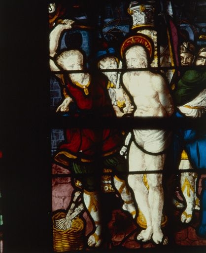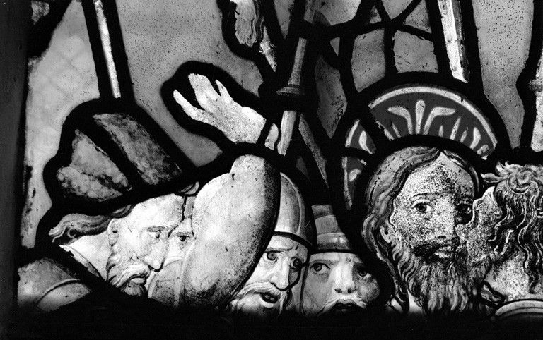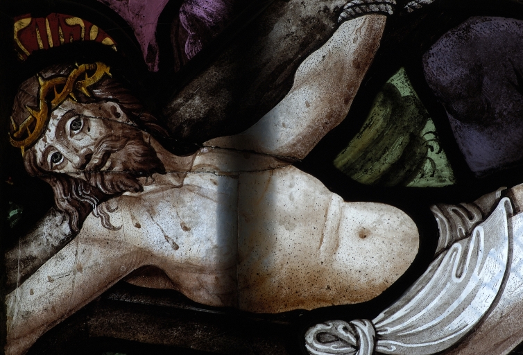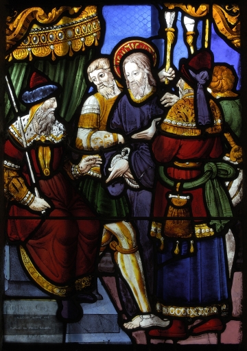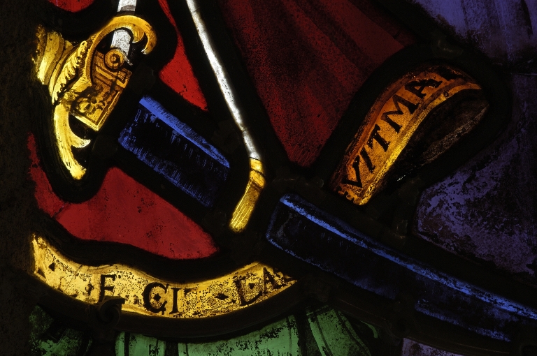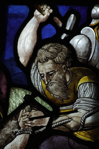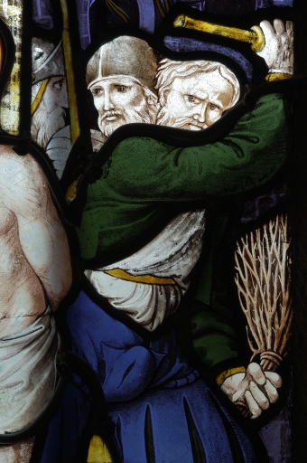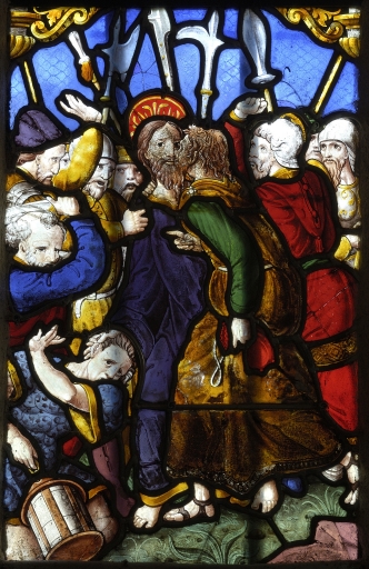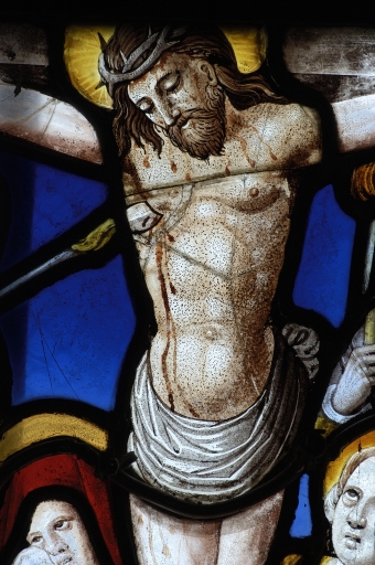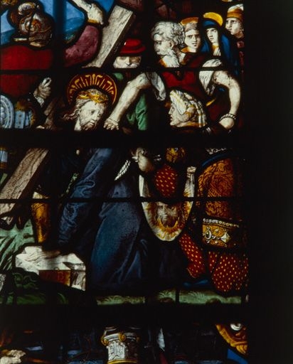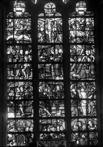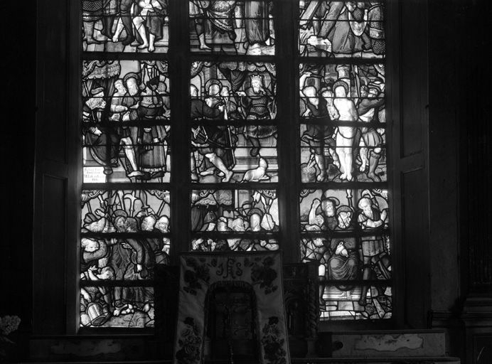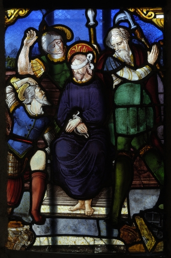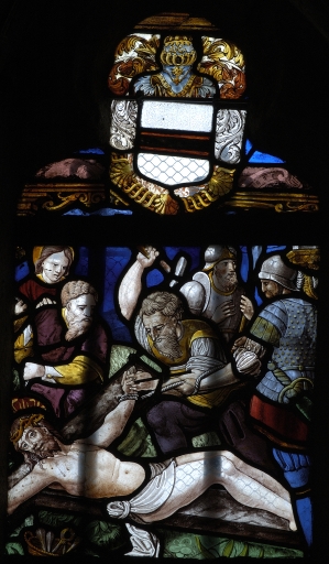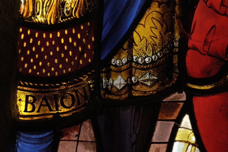 Lancette gauche, 3e scène à partir du bas : BAIONE dans le galon inférieur du vêtement du personnage de gauche. Lancette centrale, 1ère scène en bas dans l'angle inférieur droit, inscription incomplète : EN APVRIL ; 2e scène à partir du bas, inscription sur le galon du vêtement du soldat à gauche : [MB..] F[E]CIT - LA [..] EVIT MA[..] ; 3e scène à partir du bas : 1569 dans l´angle inférieur droit. Lancette droite, 3e scène à partir du bas, monogramme : MB sur la pierre sur laquelle s´appuie le Christ. Dans la partie supérieure des lancettes latérales, armoiries de la famille Du Bouays de Couasbouc : d'argent à la fasce de sable bordée de gueules, entourées du collier de Saint-Michel et surmontées d´un cimier à lambrequins.