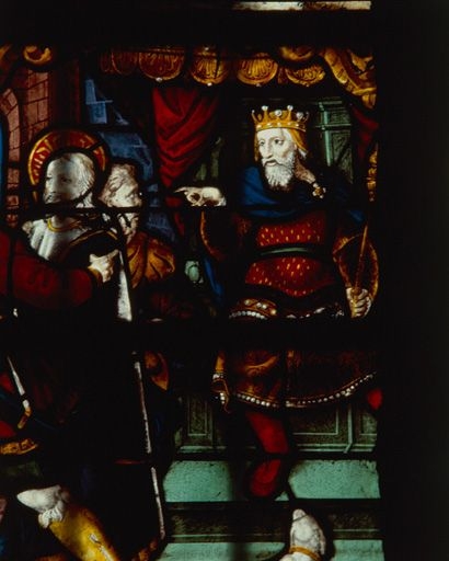 La verrière réalisée par Michel Baionne autour des années 1560 a été commandée par la famille Robert. Les armoiries des Du Bouays de Couesbouc ont peut-être été insérées vers 1661, lorsque la verrière a été remise en plombs par le verrier rennais René Boullay ; elle fut restaurée en 1901 par le rennais Emmanuel Rault et en 1998 par l'Atelier Helmbold, de Corpsnuds ; deux inscriptions, superposées dans l'angle inférieur gauche de la scène chez Pilate (a2), mentionnent ces restaurations : Restauré chez / Rault Rennes / M. Lecomte curé / 1901. / RESTAURE PAR ATELIER HELMBOLD / CORPSNUDS 1998.