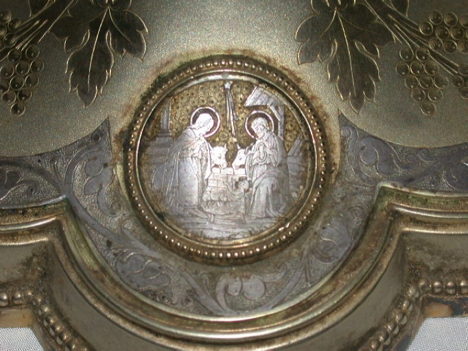 Sur le pied du calice : Nativité, Fuite en Egypte, Calvaire ; ailleurs : blé, vigne, roseaux, rinceaux.