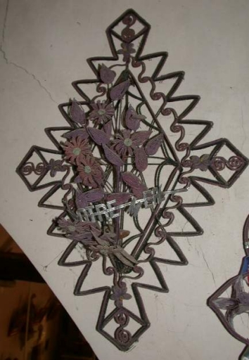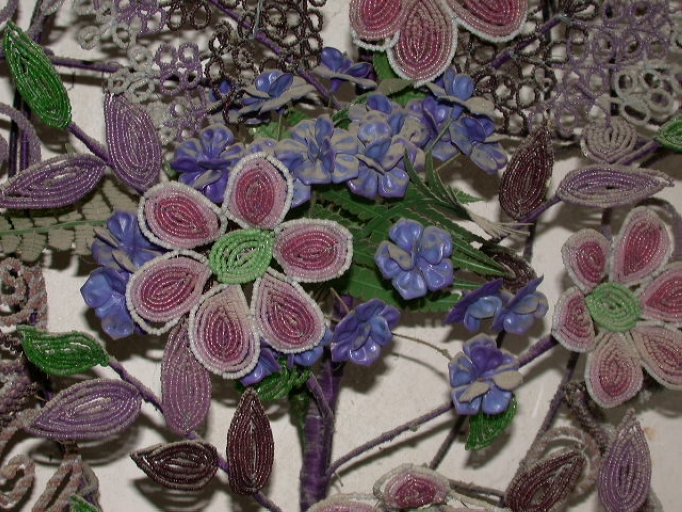 Les couronnes sont constituées de petites perles de verre multicolores enfilées sur fil de métal auquel on donne des formes de fleurs ou de volutes.