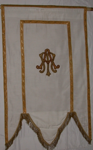 On a peut-être réutilisé les parties peintes (visages, mains) d'une ancienne bannière.