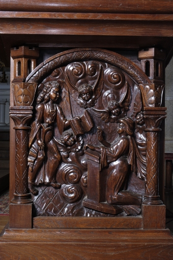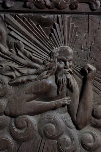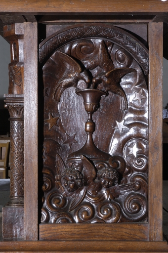 Sur la cuve : Annonciation, Calvaire, Adoration des Mages, Résurrection du Christ, ciboire, calice, vigne ; ornementation sur le pied ; Dieu le Père sur le dosseret.