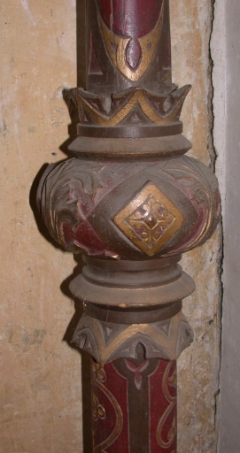 - bois, tourné, mouluré, décor dans la masse, décor en bas-relief, peint, polychrome, peint à la poudre d'or