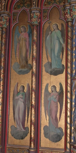 - bois, support peint, polychrome, peint à la poudre d'or, peint au pochoir