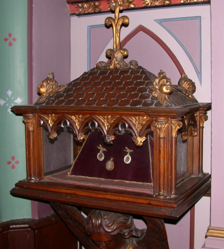 La fabrique a acheté les reliquaires en 1884 pour la somme de 200 F. Inscriptions manuscrites dans les médaillons. Reliquaire nord, de gauche à droite : S. Jacobi M. A. / ex velo S. Coeciliae / S. Franci. A. Reliquaire sud, médaillon central : St F. de Sales / Ste J. de Chantal / B. M. M Alacoque ; médaillon gauche : Ex oss. Bened. Jos. Labre ; médaillon droit : Ex Praecordiis S. Pauli a Cru.