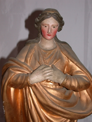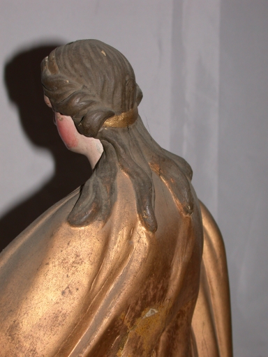 Quelques éclats et fissures dans la dorure. Traces d'insectes dans le socle.