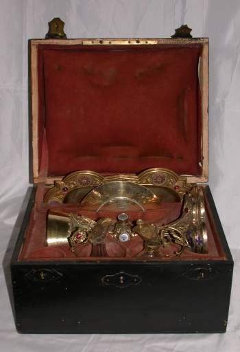 Chapelle d'orfèvrerie : calice, patène, 2 burettes et leur plateau, clochette dans leur boîte,