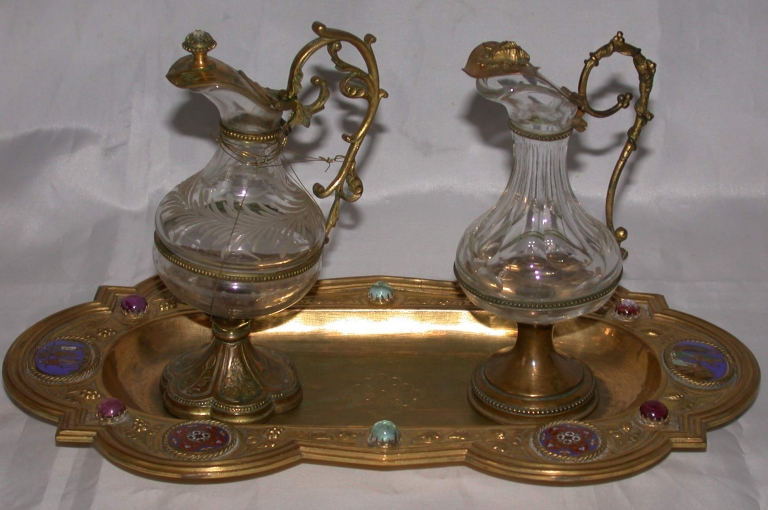 Clochette manquante. Burette à eau remplacée. Couvercles des deux burettes désolidarisés. Verre de la burette à vin détaché de son pied. Quelques éclats dans les émaux du pied du calice. Traces de moisissure dans la boîte.