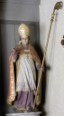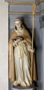 Retable à 3 corps, entablement droit, fronton curviligne orné. Les culots des statues sont en plâtre.
