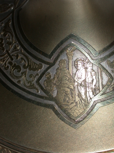 Sur le pied du calice : Pilate se lave les mains ; Flagellation du Christ ; Calvaire. Sur la coupe : Annonciation ; Nativité ; Fuite en Egypte. Ailleurs rinceaux. Sur la patène : Sacré Coeur.