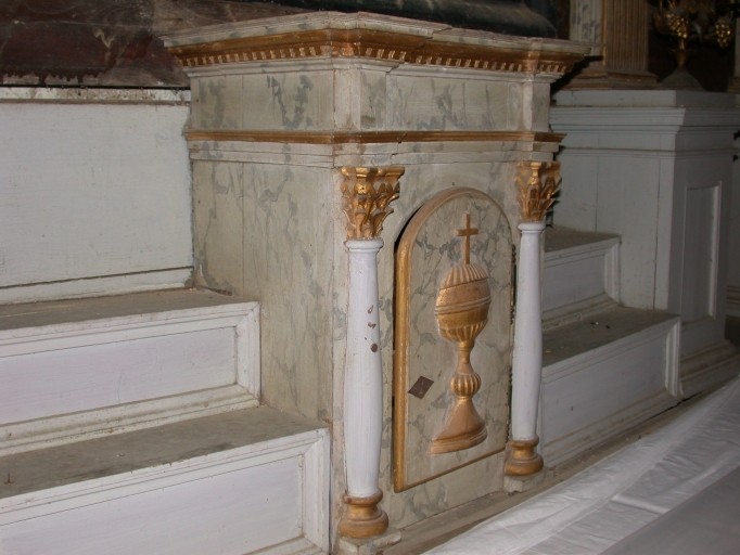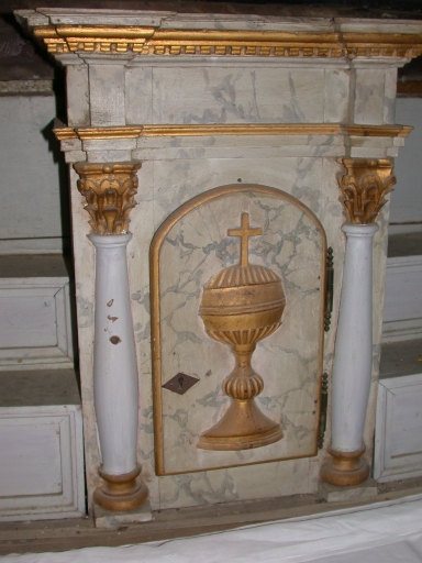Devant d'autel : croix, rinceau. Porte du tabernacle : ciboire. Retable : pilastres. Amortissement : pots à feu.