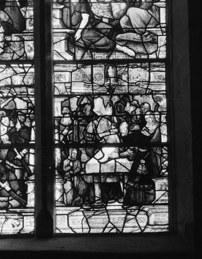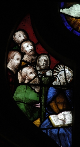 La verrière actuelle est le résultat du remontage en 1858 de plusieurs verrières d'époques différentes. Vers 1535, Adoration des bergers, Adoration des mages et Circoncision ; vers 1550, la Pentecôte (tympan). Certains verres ont été restaurés à la fin du 16e siècle (Vierge et groupe de femmes de la Circoncision) et en 1858 ; cette dernière restauration a été offerte par les paroissiens.