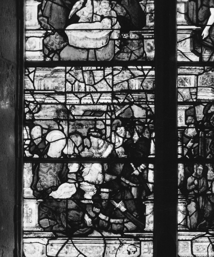 - verre transparent, peint, polychrome, jaune d'argent, grisaille