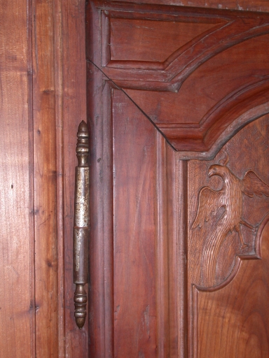 2 battants à trois panneaux séparés par des traverses à coupe d'onglet ; le panneau supérieur est cintré ; cadre à coupe d'onglet ; chaque battant est soutenu par deux fiches à vase en fer et porte une entrée de serrure (fausse pour le battant gauche). Côtés à 5 panneaux (2v 1 h 2 v) séparés par des traverses.