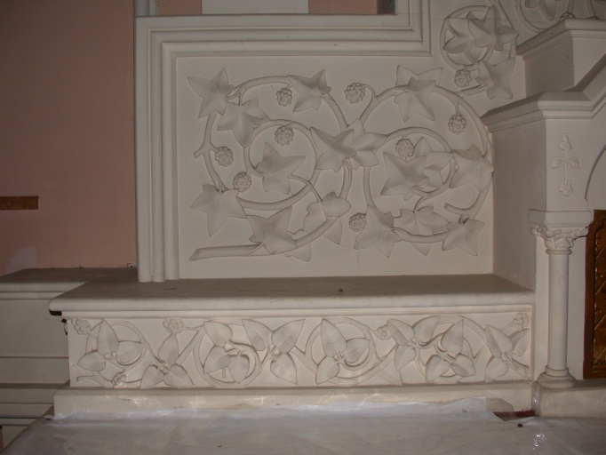 Devant d'autel : arcatures trilobées ; porte du tabernacle : croix, rinceaux ; gradin et retable : rinceaux de vigne.