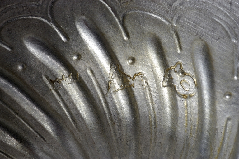 Les trois poinçons sont sous le couvercle et sous le pied. Poinçon de charge de Paris : lettre A surmontée d'une couronne fermée (1775-1781). Poinçon de communauté de Paris : lettre O surmontée d'une couronne ouverte (1777). Le poinçon de maître est illisible. Un quatrième poinçon, mal lisible (forme circulaire d'où s'échapperaient des petites flammes) est sur la coupe.