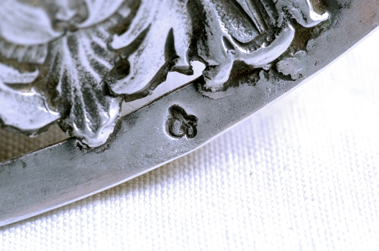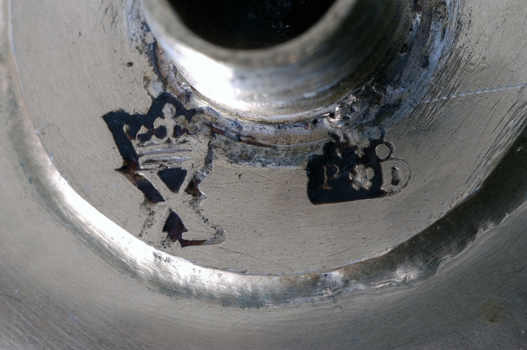 Les deux poinçons sont sous la coupe. Poinçon de communauté de Paris : lettre X surmontée d'une couronne ouverte. Poinçon de maître lisible dans sa partie inférieure : lettres P D séparées par une rosette et surmontées d'une fleur de lys encadrée de deux grains. Un troisième poinçon - une fleur de lys (?) - est sur le pied : il s'agit peut-être d'un poinçon de charge.