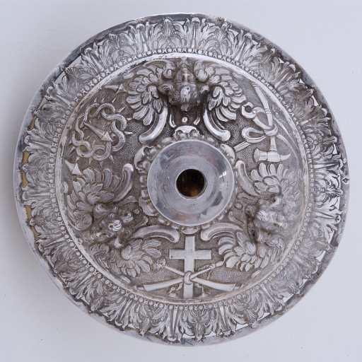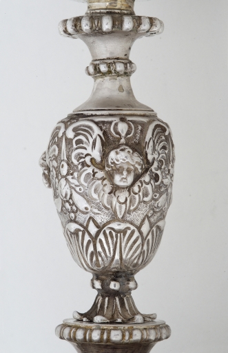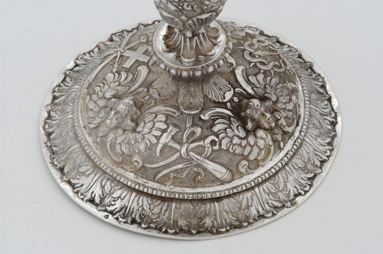 Les instruments de la Passion sont répartis sur le pied et la fausse coupe avec les angelots qui sont également représentés sur le noeud en alternance avec des chutes de fruits.