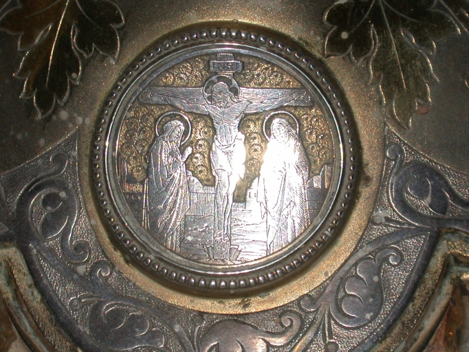 Sur le pied : Nativité, Multiplication des pains, Calvaire (médaillons), rinceaux de vigne ; tige : rinceaux ; fausse coupe : blé, roseaux, représentation végétale.