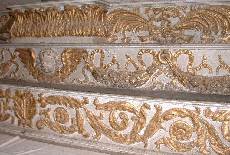 - bois, mouluré, découpé, décor dans la masse, décor rapporté, décor en bas relief, décor en haut relief, peint, polychrome, faux marbre, peint à la poudre d'or