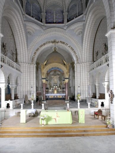 Le dessin des verrières de la coupole du choeur date de 1905. Il s´agit d´une composition géométrique de petites dalles de verre, colorées essentiellement en bleu et rouge avec quelques touches de jaune et de vert ; leur éclairage met en valeur le maître-autel dont il rejoint les tonalités de la mosaïque. La très grande verrière du bras nord du transept reprend les mêmes teintes, quoique moins saturées. Toujours en 1905, Arthur Regnault réalisa un dessin de l'élévation du maître-autel "en vue d'une demande de secours". Mais c´est un autre parti qui sera adopté : un plan de 1907 montre le choeur tout entier, en y localisant le maître-autel, le baldaquin (emplacement des colonnes), les stalles, la "balustrade" et le dallage en céramique. L´autel à soubassement de granite gris est recouvert presque entièrement de plaques de marbres polychromes de même que le tabernacle, posé directement sur l'autel, et le gradin. Le retable à redents porte un décor végétal de mosaïques et de tesselles dorées, probablement imaginé par Isidore Odorico que l'architecte associait très souvent à ses chantiers. Un baldaquin, peint ou recouvert de mosaïques, abrite le tout sous une voûte étoilée soutenue par quatre colonnes en marbre à chapiteau feuillagé doré ; chacun de ses angles est occupé par un ange jouant de la trompette. Une table de communion viendra compléter cet ensemble à partir de 1911.
