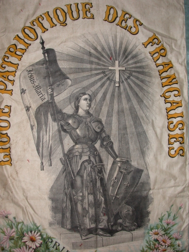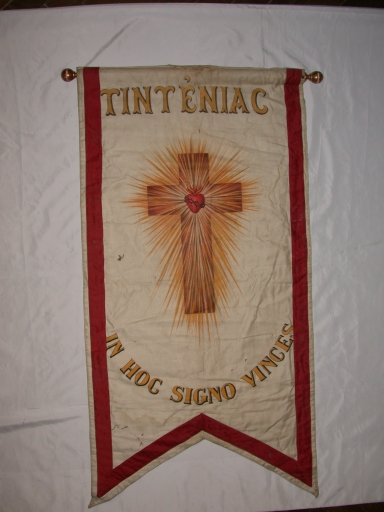 Inscriptions peintes. Sur la face portant Jeanne d'Arc : ILLE ET VILAINE / LIGUE PATRIOTIQUE DES FRANCAISES / ACTION SOCIALE CATHOLIQUE ; parmi les fleurs : PRIER / AGIR / SOUFFRIR ; sur l'étendard de Jeanne d'Arc : Jesus Maria ; autour de la croix rayonnante : DIEU PROTEGE LA FRANCE. Sur l'autre face : TINTENIAC / IN HOC SIGNO VINCES.