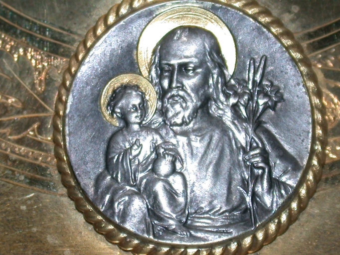 Patène : Agneau pascal dans un quadrilobe. Calice : Vierge à l'Enfant, Sacré-Coeur, saint Joseph et l'Enfant sur des médaillons sur le pied ; partout, lignes de rinceaux de vigne.