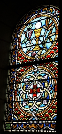 Ensemble des 30 verrières des baies 1 à 16, 18, 103 à 112, 113, 117 : Symboles des sacrements, Symboles des principaux dogmes de l'Eglise,