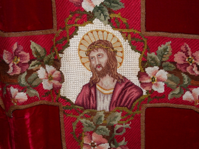 Sur la chasuble : buste du Christ couronné d'épines, croix portant des branches de fleurs au naturel.