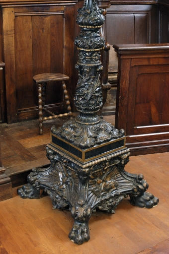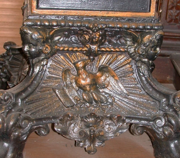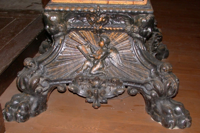 Un symbole du Tétramorphe sur chaque face du pied ; angelot sur chaque face du porte-livre.