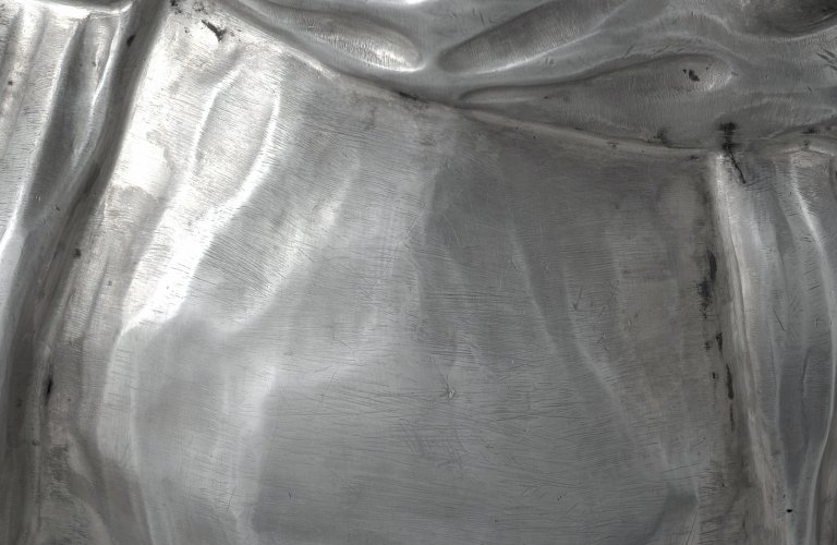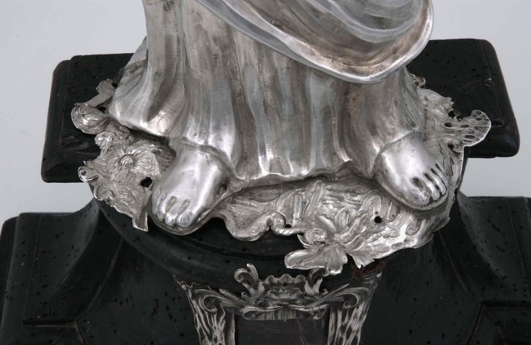 Statue-reliquaire en argent du milieu du 18e siècle, sur un socle en bois noirci. Le verre d'origine de la niche reliquaire a été remplacé par un fragment de gobelet ancien.