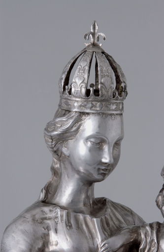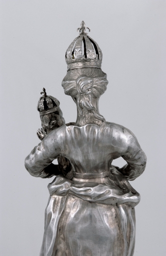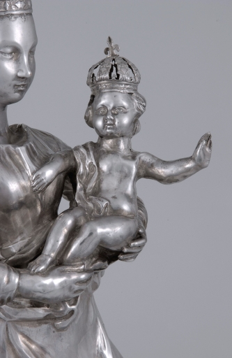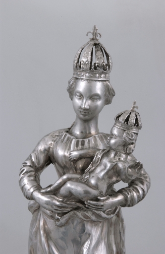 Statue de Vierge à l'Enfant réalisée vers le milieu du 18e siècle par l'orfèvre rennais Jean Loison dont elle porte le poinçon.