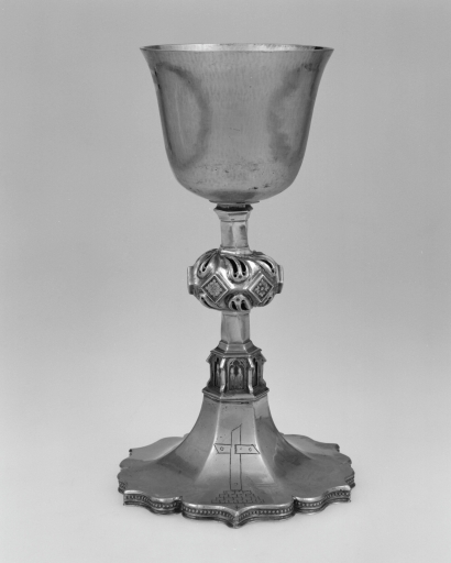 Pied et tige 15e siècle, Coupe remplacée au 2e quart du 17e siècle par Richard Drouais, de Rennes. Emaux à la base de la tige refaits au19e siècle. Une patène du 16e siècle, habituellement associée à ce calice et portant un poinçon de maître I P, est traitée dans un dossier séparé. .