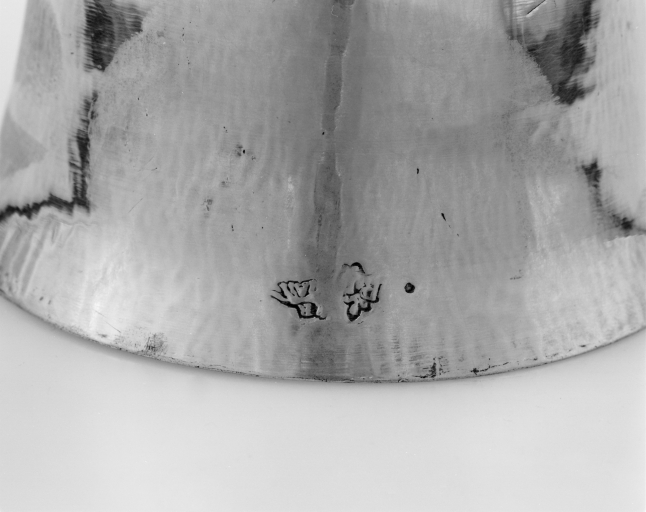 Poinçons (sur le bord de la coupe) : initiales R et D séparées par une hermine, un point sous chaque lettre, une fleur de lys au dessus : maître Richard Drouais ; communauté de Rennes, vers 1630 : hermine passante, lettre R au dessus, lettre A entre les pattes.