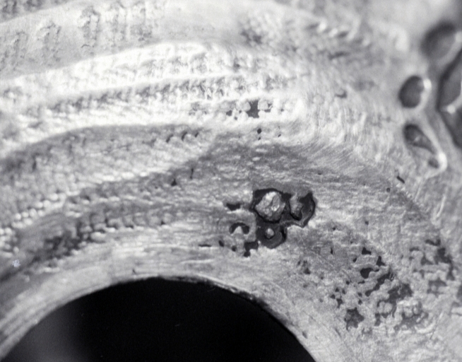 Poinçon de maître : initiales F et G séparées par une hermine, une fleur de lys encadrée de deux grains de remède couronnée au dessus, François Nicolas Joseph Girard de Rennes ; charge de Rennes vers 1781 : un neuf fleuronné couronné ; lettre date 1781-1783 : un Y surmonté d'une hermine couronnée.