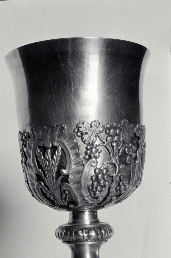Une trentaine d´années après, ce calice réalisé entre 1781 et 1783 par François Girard reprend une formule déjà employée par Tanguy-Gabriel Fouqué vers 1745, sur un calice conservé dans le trésor de la cathédrale de Rennes. Là encore l´attachement à un style déjà vieux de quelques décennies est manifeste et, si l´on met à part les discrètes chutes de fleurs fondues et appliquées sur le noeud, suspendues à des noeuds de rubans, il n´y a guère sur l´objet de référence au goût néo-classique. Il semble en l´occurrence que comme le constat en a déjà été fait pour des oeuvres de la première moitié du 18e siècle, l´orfèvrerie religieuse ait pu conserver plus longtemps que la production civile des formes antérieures.