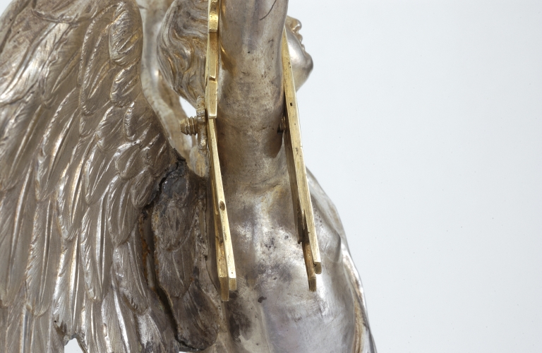 Les rayons, dédoublés de part et d´autre des bras de l´ange, sont maintenus par des broches dont les écrous, moulurés sur la face antérieure sont escamotés dans les rayons. Cet assemblage est une véritable trouvaille qui remédie à cet endroit fragile aux risques de fracture et accentue en même temps par son aspect illusionniste l´idée du rayonnement de la gloire divine. Le raccord de la nuée céleste sous les pieds de l´ange avec le socle fait l´objet d´un même soin qui renforce l´assemblage des deux parties en même temps qu´il maintient l´esthétique baroque du débordement. Enfin la qualité d´exécution du socle, les agrafes, les chutes de feuillages finement ciselés rapportés qui masquent, la soudure des quatre faces, la ciselure du manteau et des ailes de l´ange, ainsi que l´emploi de rayons plein et non simplement estampés contribuent à la grande qualité de l´objet.