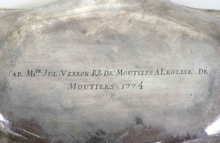 Bassin et burettes réalisés par Gabrielle Bidard, veuve de l'orfèvre rennais Claude Roysard, offerts en 1774 à l'église de Moutiers par le recteur Julien Verron.