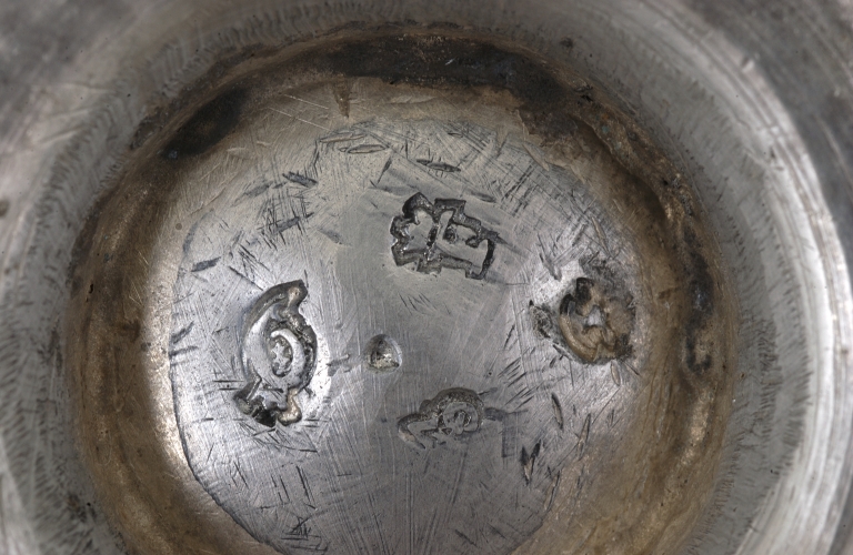 Inscription gravée sous le bassin et sur le pied des burettes hh : D. PAR Mre JUL. VERRON Rr DE MOUTIERS A L'EGLISE DE MOUTIERS, 1774. Poinçons (sous le pied des burettes) : poinçon de maître : initiales G et B séparées par une hermine, lettre V en pointe, une fleur de lys encadrée de deux points et couronnée au dessus, gabrielle Bidard, veuve de Claude Roysard ; poinçon de communauté : lettre F couronnée, Rennes 1753 ; charge de Rennes : neuf couronné ; décharge de Rennes, 1753 : une doloire.